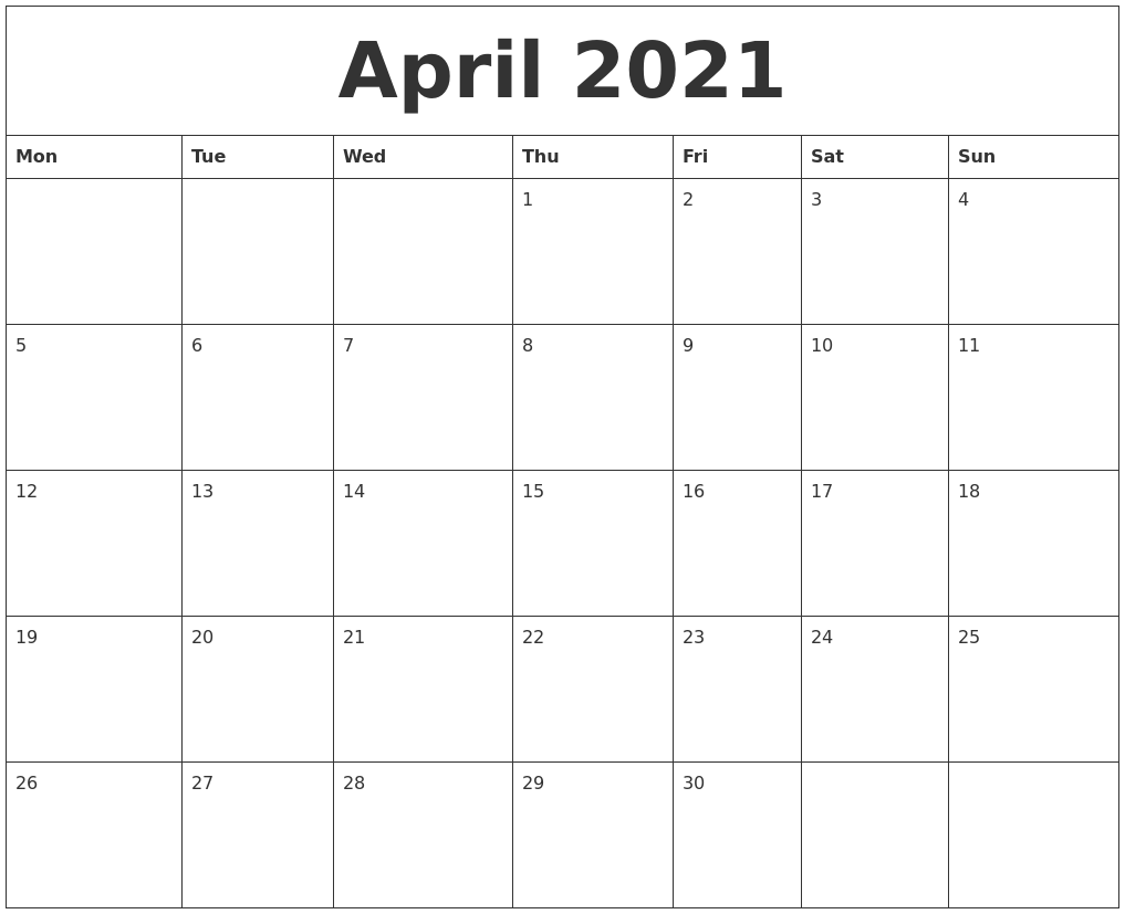 Monthly calendar for the month april in year 2021 april 2021. Monthly calendar for the month april in year 2021.